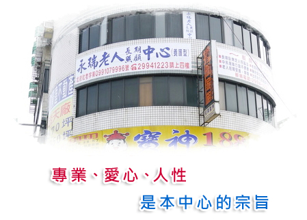 關於我們 機構介紹 機構介紹 中心介紹: 緊鄰頭前公園綠地,與市政中心。 本中心佔地約354.5平方公尺。 醫師定期巡診、復健指導。 緊臨署立醫院台北院區。 備有各式復健器材。 民國100年01月10日設立、北府社老字第0991079996號。 目標: 結合醫師、營養師、復健師、專業護理人員優良的團隊,提供長者優質的生活品質如同居家的感覺和溫馨。 服務理念: 實現禮運大同編,暨使老有所終,壯有所用,幼有所長。 鰥寡孤獨廢疾者,皆有所養。 及「老吾老以及人之老」之精神,滿足長者需求,讓長者在永瑞老人長照中心,安享晚年。 返回